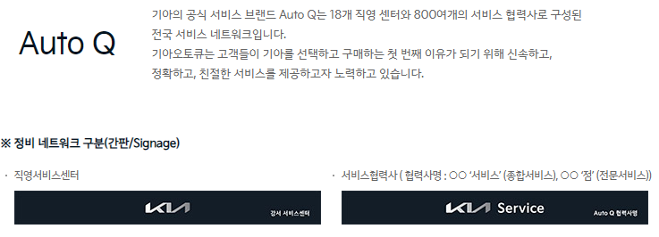 기아 오토큐는 기아자동차의 공식 서비스 브랜드로, 전국에 걸쳐 18개의 직영 서비스센터와 800여 개의 서비스 협력사를 운영하고 있습니다.