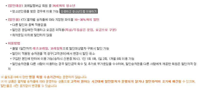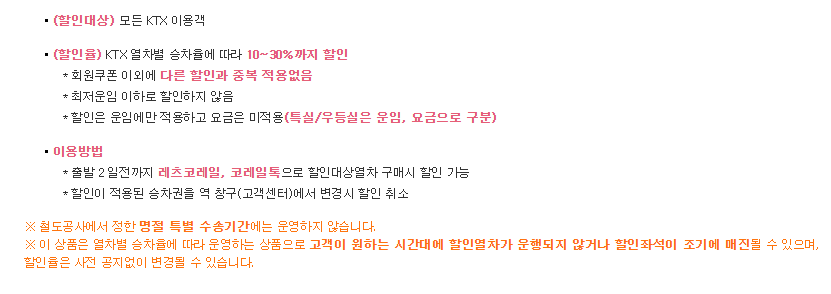 - 인터넷특가 특정 열차의 좌석을 할인된 가격에 제공
